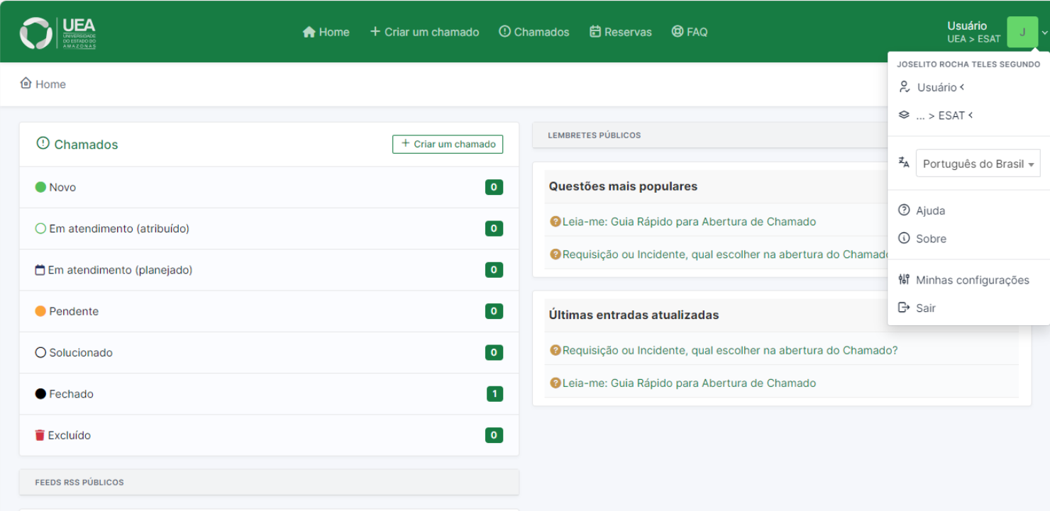 Conteúdo1. Acesso ao SistemaAcesse ao endereço https://glpi.uea.edu.br e preencha os campos com o seu usuário e senha de domínio (a mesma credencial utilizada para acessar os sistemas internos e e-mail institucional sem o @uea.edu.br). Figura 1 – Tela Inicial da Ferramenta 2. Verifique sua Unidade OrganizacionalPara facilitar o contato da equipe de suporte verifique se sua unidade organizacional está correta. Para realizar verificação, click em cima da letra inicial do seu nome, conforme figura abaixo. Caso a unidade organizacional esteja errada será necessário a abertura de uma requisição para alteração da mesma. 3. Registre um chamadoToque na opção Criar um chamado conforme imagem abaixo: Em primeiro lugar você deve selecione o tipo de chamado: Incidente ou Requisição. INCIDENTE: É qualquer acontecimento que ocorre com algum componente que tenha alguma ligação com um serviço já prestado pelo departamento de TI e que não faça parte do comportamento padrão de usabilidade causando assim a redução na qualidade do serviço de TI ou até mesmo a interrupção do serviço como um todo. Abaixo alguns exemplos: ► Internet Lenta; ► Computador não liga; ► Um relatório do Lyceum não abre; ► Impressora com problema para imprimir.