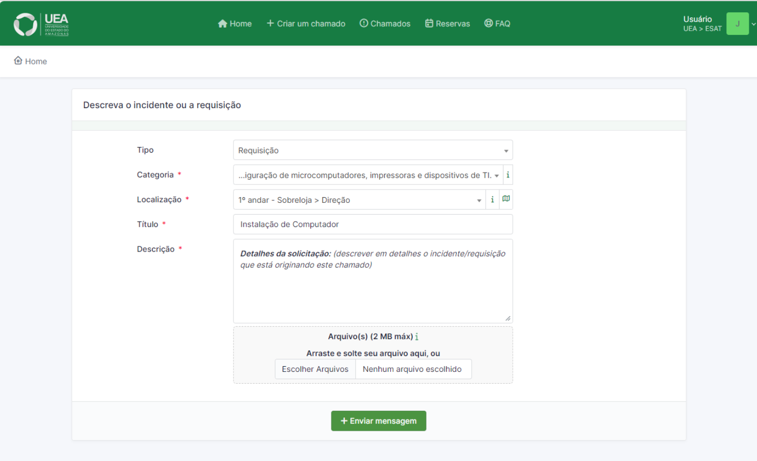 Preencha todos os campos obrigatórios e na descrição do problema detalhe o máximo de informações possíveis, selecione o item enviar mensagem, após o envio da mensagem será exibido uma mensagem na tela e um e-mail será encaminhado para sua caixa de entrada institucional com o numero do chamado e o link para acompanhamento. Abaixo o exemplo de um chamado em que o usuário está requisitando a instalação de um computador onde se faz necessário o detalhamento da solicitação. Nos casos que o usuário desejar incluir documentos para auxiliar no atendimento, basta clicar em Escolher arquivos, e abrir o documento selecionado. 4. Acompanhando um ChamadoNa tela inicial, você poderá verificar quantos chamados possui de acordo com seu status (Novo, Em atendimento, Pendente, Solucionado...) Clique na guia Chamados para listar suas solicitações que se encontram em andamento. Para detalhar um chamado, clique em seu título. Na tela seguinte, serão exibidas diversas informações referentes ao seu chamado
